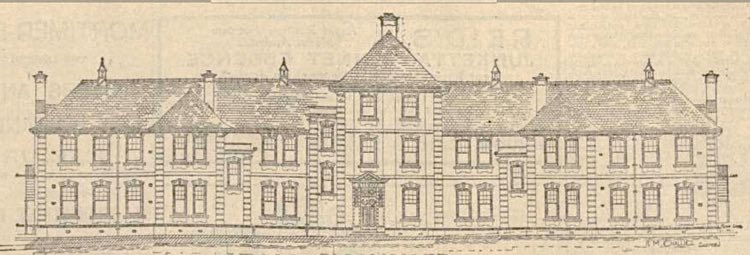 A plan of the infirmary opened in 1905. The infirmaryl was behind the old workhouse/workhouse. The left hand block is shown in the photo below.