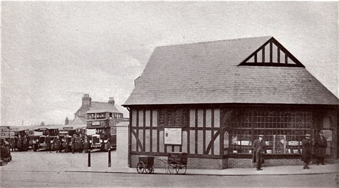 The Tudor style Information Bureau at Paul Street bus station. Notice the hand carts for delivering parcels.