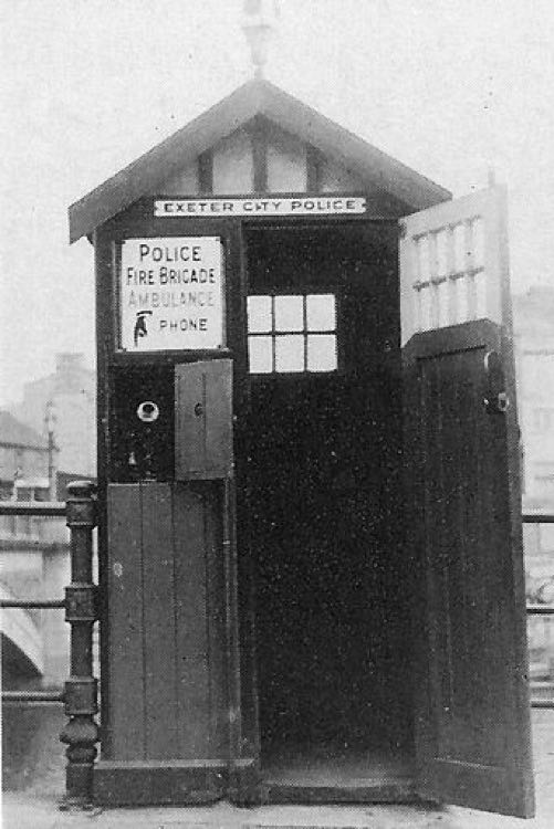 Pillars were, at first, triangular in shape (see left), painted blue, with an orange light at the top, with one telephone for Police Officers, and another for use by the public. These remained until 1959, when the city’s Police Headquarters moved to new premises in Heavitree Road. The “Tardis” boxes were then removed from the streets, and all of the old pillars were replaced by modern, square pillars (see right), designed to house a telephone, and a lockable storage compartment below. The door of this compartment was hinged at the bottom, and when opened could be used by Officers as a “table” on which to rest when writing notes etc.