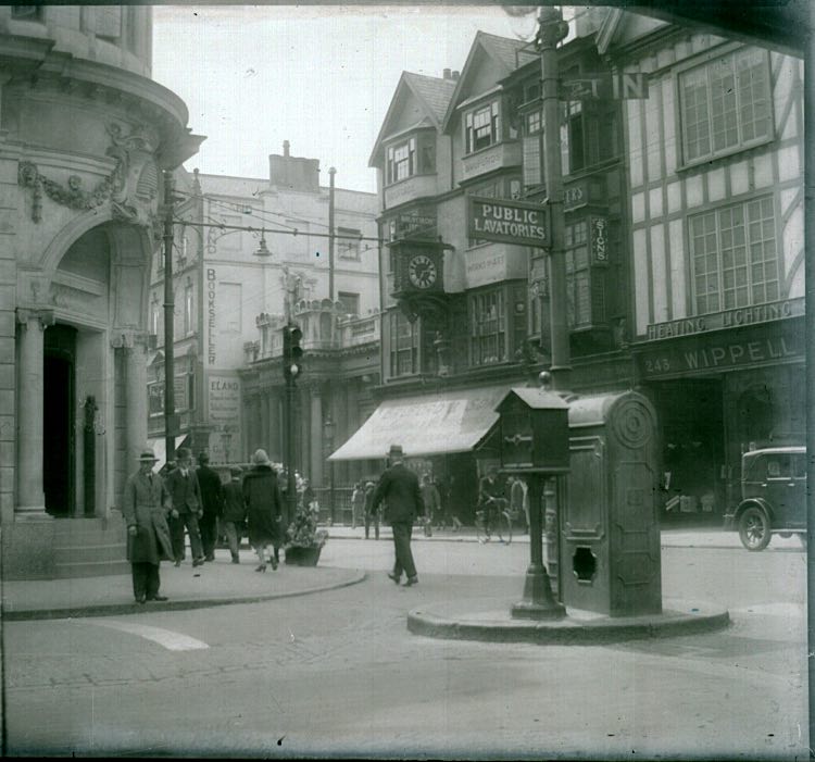 In 1925 the City was newly-equipped with over a dozen Police boxes (the blue structures, shown left, frequently referred to these days as “Tardis” boxes), and a few triangular–shaped pillars. The idea of these was basically to provide a telephone for the public to contact any of the Emergency Services, and for the Police Station to be able to contact the nearest Police Officer by means of a flashing orange light at the top. (Bear in mind there were few private houses with telephones in 1925). The lights were operated from the Police Headquarters which, at that time, was situated in Waterbeer Street. The early wiring system could only cope with up to three pillars, so multiple sets of cables were required to operate all the pillars in the city. The control box at the police station was designed to operate a maximum of 33 pillars.