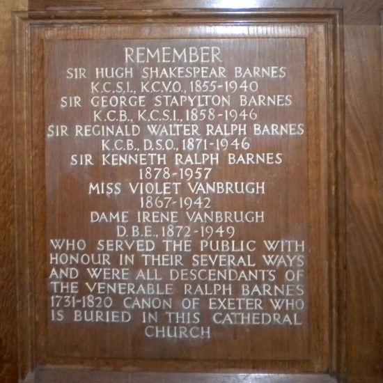 On a stall near the High Altar of the Cathedral is a plaque asking us to remember six descendants of the Venerable Ralph Barnes sometime Vicar of Heavitree, and Canon of Exeter who is buried in the Cathedral and whose memorial is in the south quire aisle. Four of these are children of Rev. Reginald Barnes, namely Sir Reginald Barnes, Sir Kenneth Barnes, Miss Violet Vanbrugh and Dame Irene Vanbrugh and we are asked to remember them for serving the public with honour in their several ways.