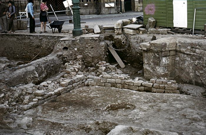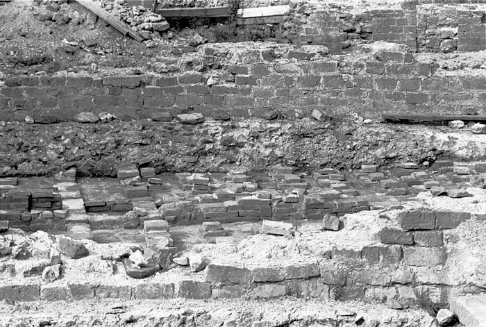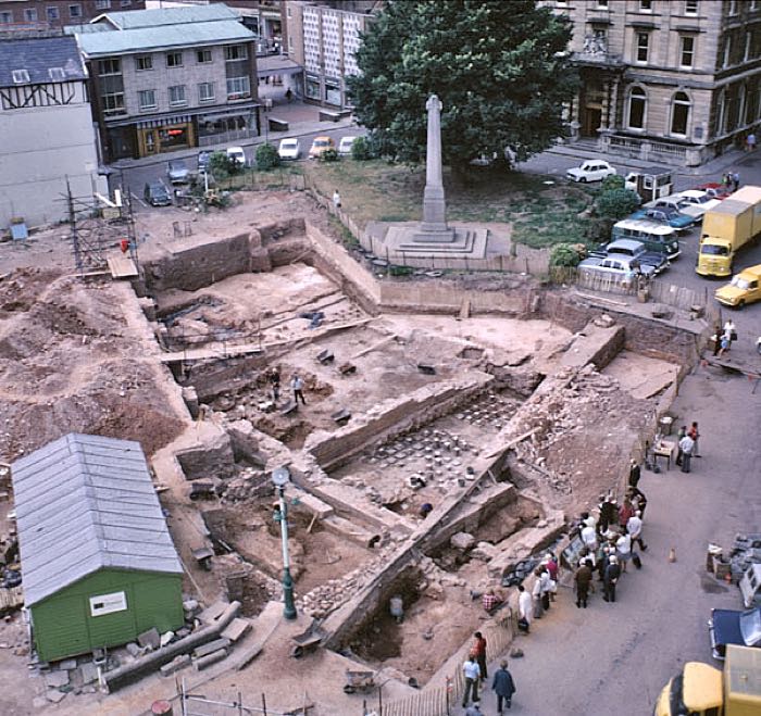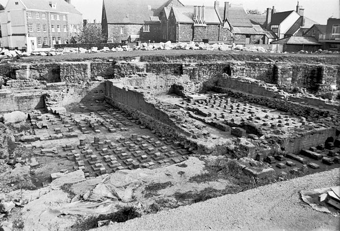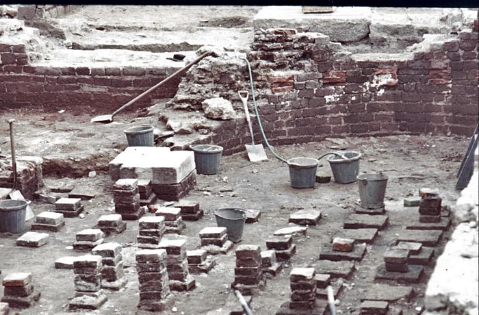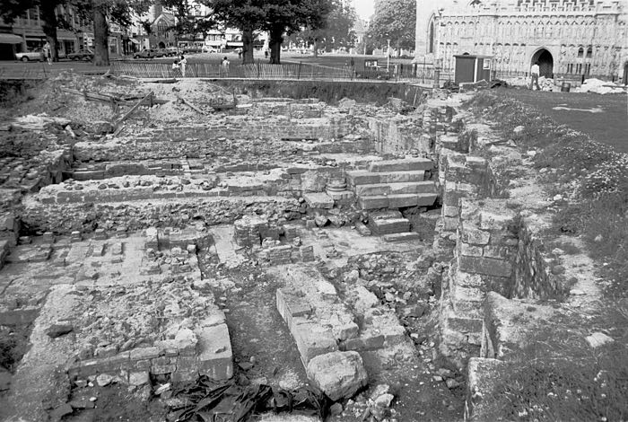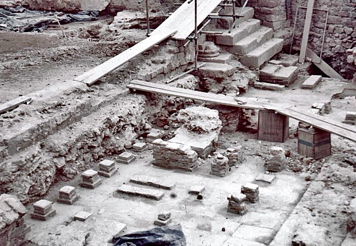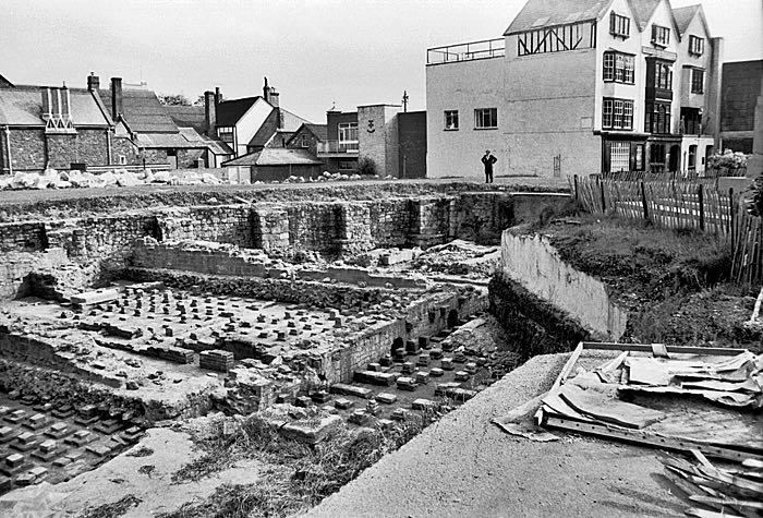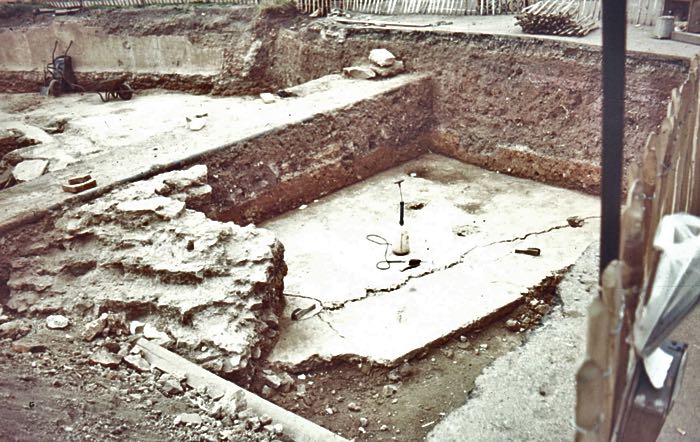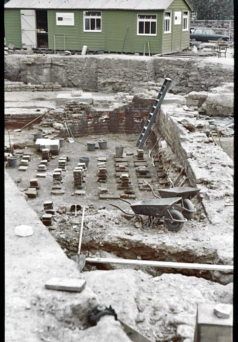 After St Mary Major Church was demolished in 1972, the archeologists removed the church's floor to expose pre Saxon remains. After their careful removal , the upper Roman archeology was found. This is probably the floor of the bath house, beneath which, was the hypocaust. © Alan Mazonowicz