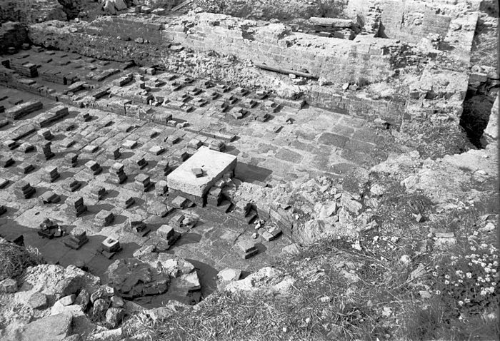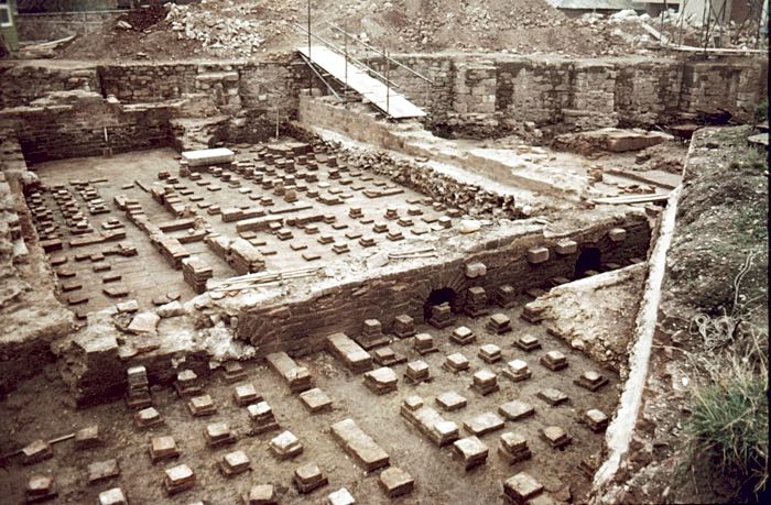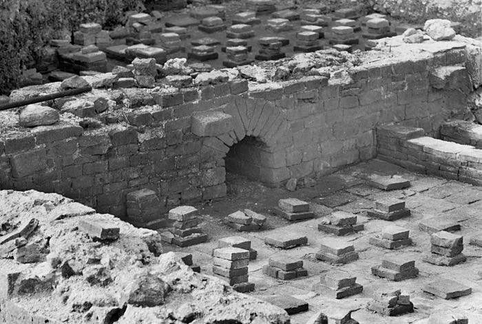 The floor of the bath house rested on the short pedestals of the hypocaust, creating an under floor space for the hot gases to flow, and heat the floor.