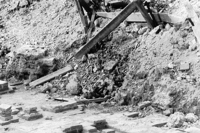 St Batholomew Yard was opened and Cathedral Green lowered. The remains shown in this photo indicate many years of burials. © Alan Mazonowicz
