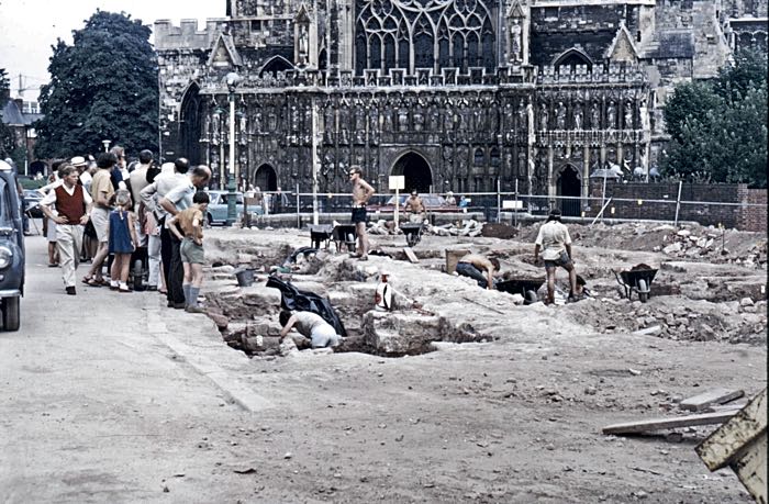 It is easy to assume that the bath house is right in front of the West Front, from this photo. However, the angle of the towers indicate that the remains are well to the right of the steps down from Broadgate. © Michael T J Wride.