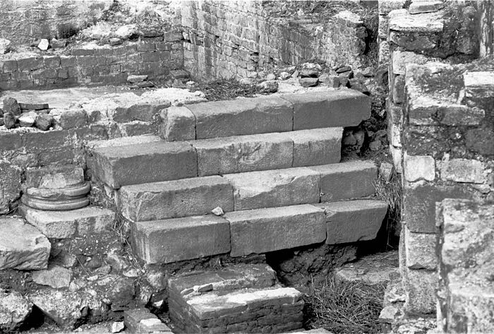 These steps led down to the bath house. Notice the base of a carved column to the left.