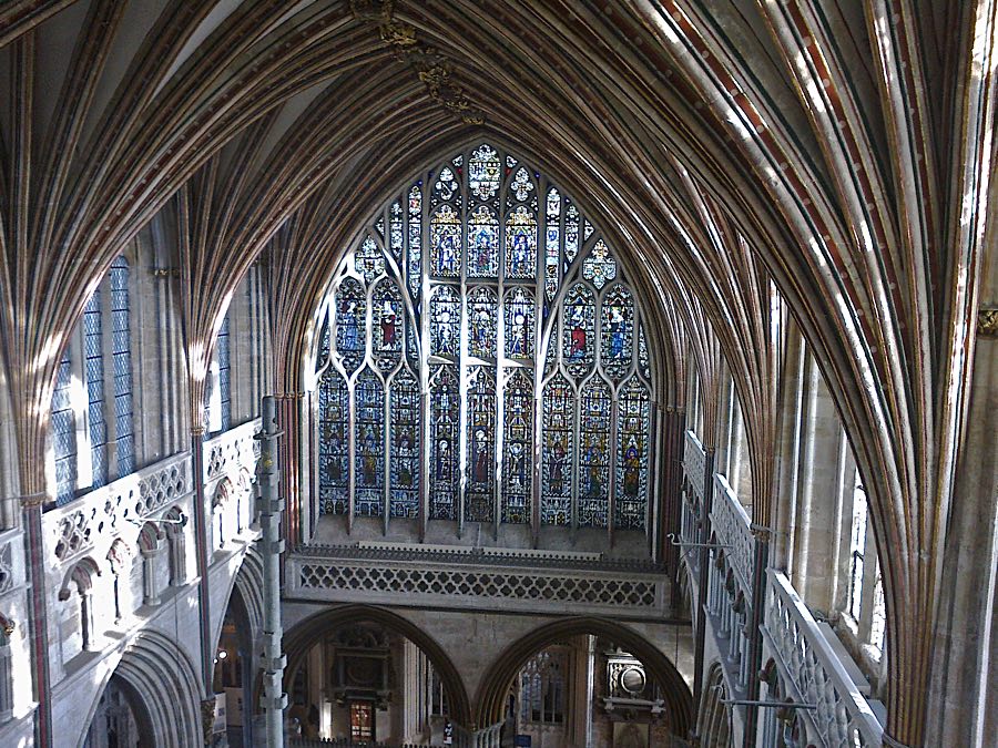 The Great East window contains much 14th Century glass. Photo taken from above the Bishop's Throne.