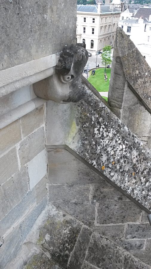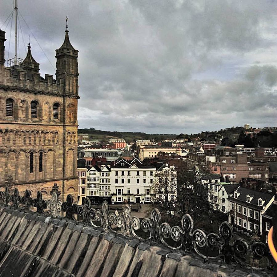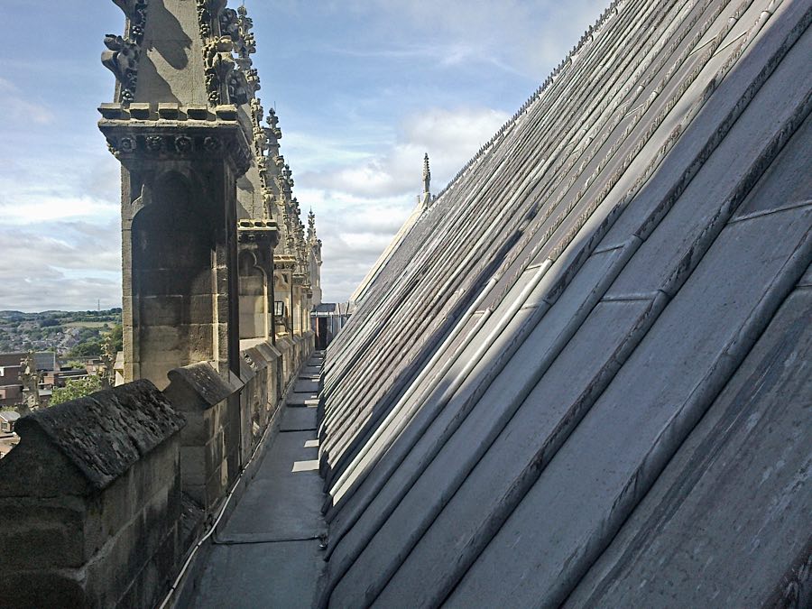 Photographed from the end of the roof, above the Lady Chapel, the tower of St Michael's, Mount Dinham can be see on the right.