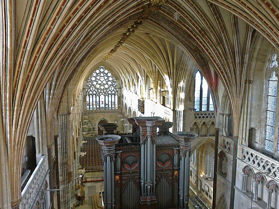 The Great West window at the end of the nave. The top of the Cathedral organ is in the foreground.