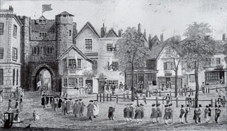 One of seven gates around the Close, constructed after the murder of Walter Lechlade in 1283. The gate was removed in August 1819, during the driest and hottest weather of the previous 20 years. Traces of the gate can be seen in the shop on the corner, while two posts marks its position.