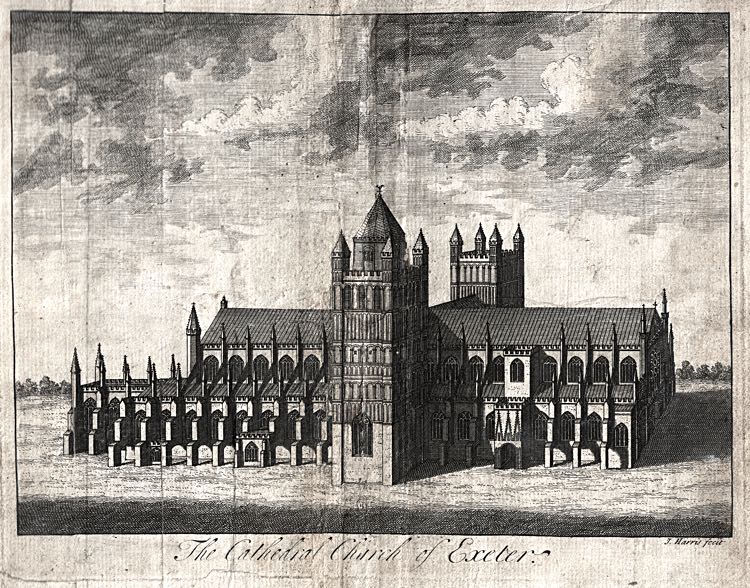 This page is too short to cover the history and architecture of the Cathedral. But it is because of the Cathedral, that the Close exists. The West Front is a glory of Gothic carving, while the towers have the earlier, solid construction from the Normans. Enjoy the Green, Close and Yard, especially on a sunny day, and marvel at the two thousand years of history in such a compact place. The illustration, from Izacke's History of Exeter, shows the North Tower with a spire.