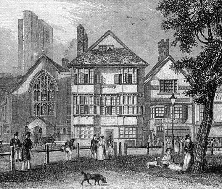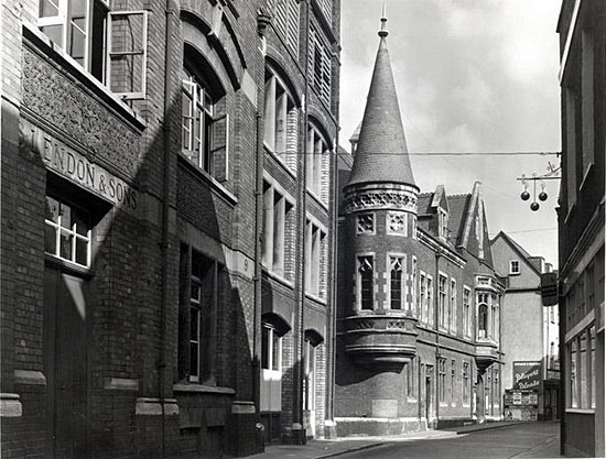 This attractive building, was constructed by a dentist named Brand in 1871, in what was described, at the time, as a 'French chateau style'. An impression of the building before 1871 is shown, left. The lane on the right was Lamb Alley, which once gave access to workshops and tenements between the buildings on Cathedral Yard and the High Street. The October 2016 fire started in this building–thankfully, the facade has survived and hopefully it will be restored.