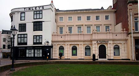 On the corner of Broadgate Pizza Express, remembered fondly by many as Tinleys Tea Shop. Charlotte Treadwin, Queen Victoria's favourite lace maker, had her first lace showroom on the site of Pizza Express. The bank building was originally the National Provincial Bank, and dates from before 1860.