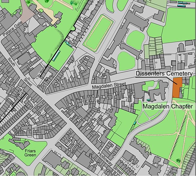 The burial ground has since been cleared, and many of the memorials moved to each side of a path, to allow them to be viewed. A team of volunteers has also spent many hours tracing and transcribing the many names and enscriptions on the gravestones. It will be a place of reflection and tranquility, open to the public, and remind people of Exeter's rich cultural heritage. See the Exeter Dissenters Graveyard Trust website.