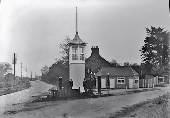 The filling station. The tower is in the approximate position of the gallows tree. Note that the sign below the tower reads Carburine, a petrol brand of the time. © Bertram Arden.