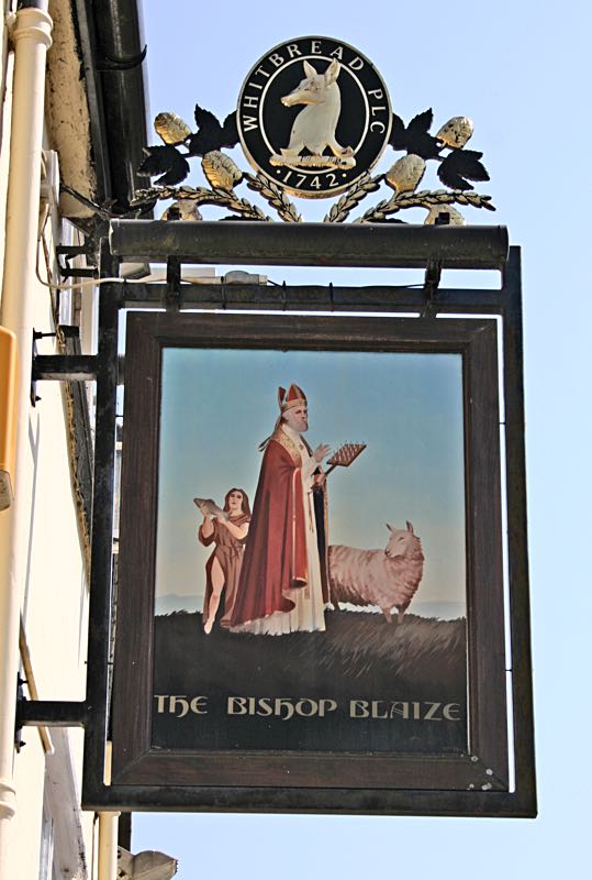 An Armenian, Bishop Blaize became the patron saint of clothworkers - he was persecuted for heresy against the prevalent worship of idols, scourged with iron combs and beheaded in AD 298. The sign shows the Bishop holding a woolcomb, the symbol of his martyrdom.