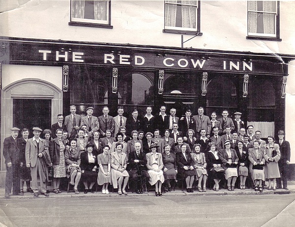 An outing of customers pose outside the Red Cow, probably in the 1940s.