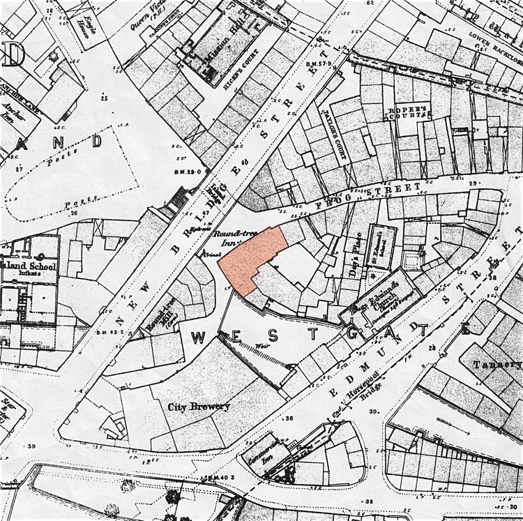 The last landlord of the Round Tree Inn was James Frederick Berry, who married Jane, the daughter of the previous landlord, William James Taylor. The license was not renewed in February 1903 because Berry had taken the Queens Head in Edmund Street, and used the Round Tree as a common lodging house. It was eventually swept away, with the rest of Frog Street, in the 1960s for Western Way.