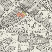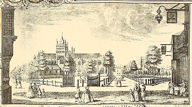 View of the north side of the Cathedral from Catherine Street, Martins Lane. The Rummer Inn is on the right. From Roques 1744 map of the city.
