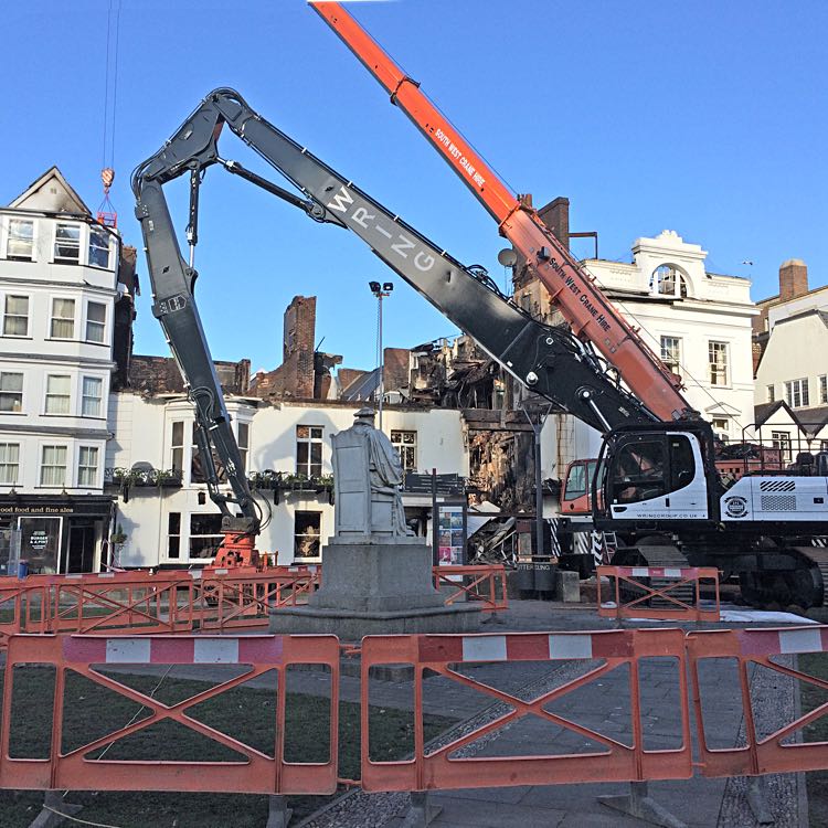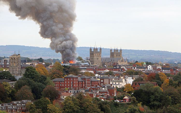Perhaps the biggest tragedy for the city, for its historic heritage since the blitz of 1942, was the fire in Cathedral Yard that destroyed the Royal Clarence. The fire was discovered at 5.30am in, 18, Cathedral Yard, the upper floors of which, were in the process of being converted into luxury apartments. Despite the best efforts of the Devon and Somerset Fire Service, with elements of the Dorset Fire Service, within hours the building was gutted. It was thought the worst was over, until flames started leaping through the roof void of the Well House to the Royal Clarence. The fire fighters struggled to prevent it spreading ever further. By early afternoon, not only smoke could be seen from across the city, but flames leapt high into the sky. The fire burned through the afternoon and night, as the Union Flag defied the inferno, eventually to succumb, and half the Royal Crest tumbled into the ruins. The fire was still burning on the morning of the 29 October, fed by a broken gas main–the grand old hotel was a sorry sight, completely gutted, while the front wall was collapsing. By lunch time, damping down was continuing, and structural engineers assessing the safety of the front facade.