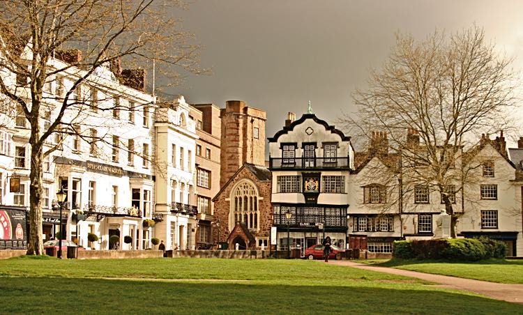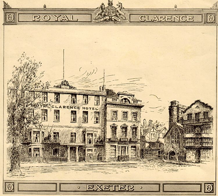 The Exeter Bank opened on 9th July 1769 on the site of the aforementioned Rummer Inn. It became the first Deller's Cafe in Exeter during 1906. Sometime after 1919, Deller's closed, having opened a new cafe in Bedford Street. The Clarence took over the premises, and had 27 rare 16th and 17th Century Flemish stained glass windows installed by Maurice Drake, who had his glass studio at No. 4 Cathedral Yard, one of the Three Gables.