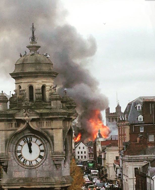 The Clocktower, Rougemont Hotel and Cathedral as flames leap up from the Royal Clarence Hotel, 28 October 2016. Photo by Brian Arnold.