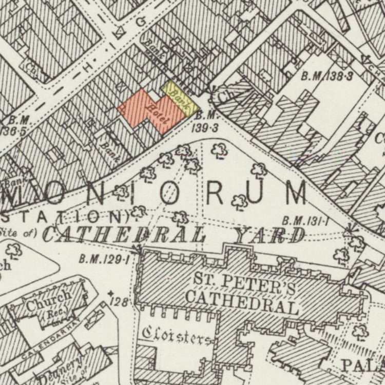 "The only house, worthy of notice in its parish is, The Hotel, a large commodious Inn, with elegant apartments and Hotel accommodation for people of the first quality, with a large assembly room in which assize balls, concerts and assemblies of the most distinguished persons of City and Country take place, in the front is a neat coffee room. The situation of 'The Hotel' is very pleasant as it opens to the parade and commands a noble view of the Cathedral."