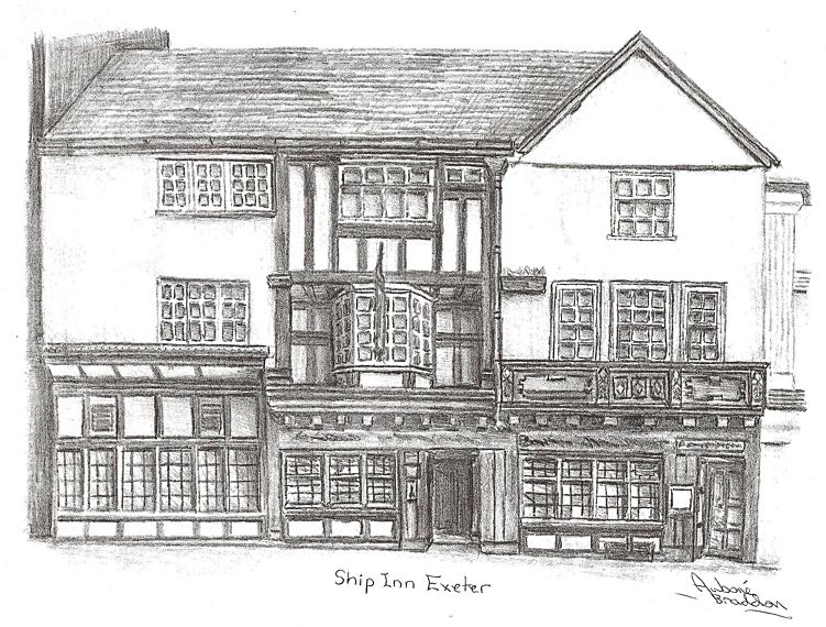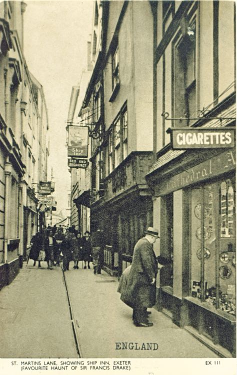 Ship Inn in Martins Lane, just off Cathedral Yard, is one of Exeter's more iconic tourist attractions. The sign shows a