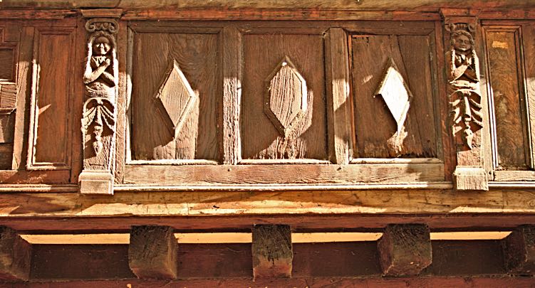Although Historic England state it is 16th Century, it is probably 15th Century. Substantially rebuilt in the 19th Century, and into the last century, the overhanging timber front and gable has been restored. The carving on the front is not old. The building was just outside Martins Gate, the remnants of which can be seen on the wall of the corner building.