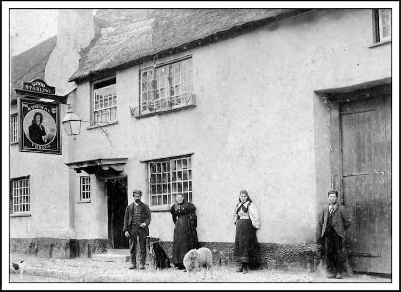 Probably customers and a sheep pose outside the Admiral Vernon in the days of a far more rural Devon.