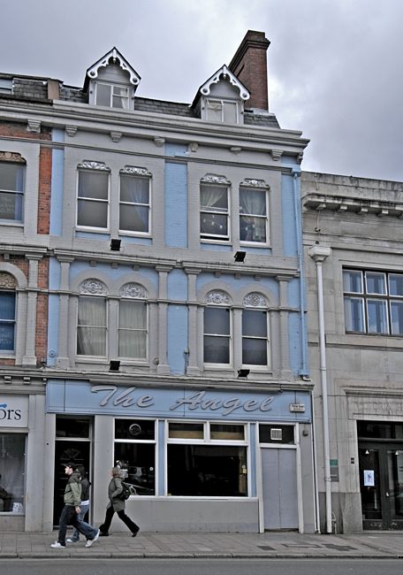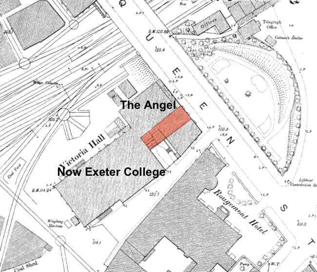 It was in 1869 that the Victoria Hall was built in Queen Street, to provide a 2,000 seater hall for conventions, exhibitions and concerts. The hall was situated to the rear of a vacant plot of land that fronted Queen Street. While the construction of the hall took place, Mr Pinn, a builder, started to construct two houses on the plot of land. He soon got into trouble for building a chimney wall at the rear of the property that was only 4½ inches rather than 9 inches thick, thinking that the 2ft wall of the adjacent Victoria Hall would be sufficient to prevent a fire spreading. The right hand of the pair of houses that Mr Pinn constructed, would become The Angel.