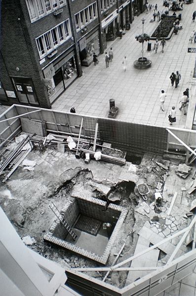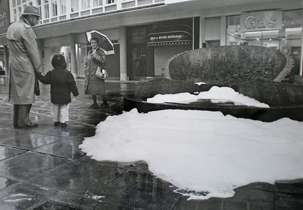 NEW The Exeter Phoenix Blitz Fountain at Princesshay. The memorial was for the blitz of Exeter, in April and May 1942. The fountain was created by Roger Dean using fibreglass, and unveiled on the 50th anniversary in 1992. The photo left shows the foundations of the fountain during construction. The piece became a target for bottles of detergent, causing a mountain of foam to swell up and flow across the pavement. Photos Express & Echo