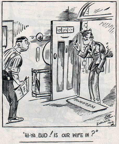 "You see, pal, we're a hell of a way from home – in a strange country away from our wives and sweethearts. We get lonely and homesick. The 'dolls' and the 'scotch' help us to forget all that, and who knows when we'll get back home again – if we ever do? O guess your British guys are doing the same overseas, and when its all over they'll come back to their wives and sweethearts, and carry on where they left off before this goddamn war started.
