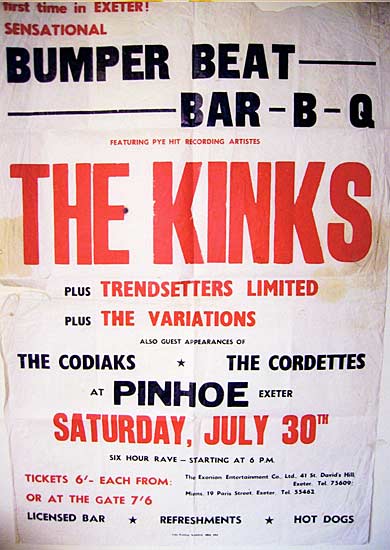 On another occasion we did an open air gig at Pinhoe, a first for Exeter. The event was organised by Exonian entertainments and was billed as a ’Bumper Beat BBQ’, with tickets priced at 6 shillings (30p) or 7/6 on the gate. Top of the bill were The Kinks, supported by Trendsetters Ltd, Exeter band, The Variations, together with the Codiaks and ourselves.