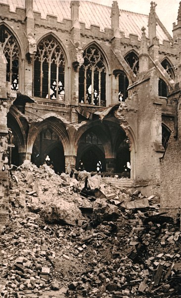The whine and crump of bombs continued and we sat in our staircase and swore at the Hun for thus daring to damage our beautiful city and Cathedral. The glow in the Cathedral got brighter and redder and smoke came swirling down the staircase. We decided that the north nave-aisle roof must be on fire and that we had better go round the outside and investigate before going up into it. We crossed the Cathedral in a lull, the broken glass crunching under our feet. The baize door from the south Transept was lying down the steps and we clambered over it to reach the Garth. At the gate we met a policeman who said that the north side of the cathedral was undamaged, but that Bobby’s shop was well and truly on fire, lighting up the sky and sending a stream of sparks overhead. That being so we took cover again for a short time while bits of plaster and tiles rained down around. Came another lull during which we drank a grateful cup of tea with the verger’s wife under the library stairs. While we drank there rose the wail of the All Clear.