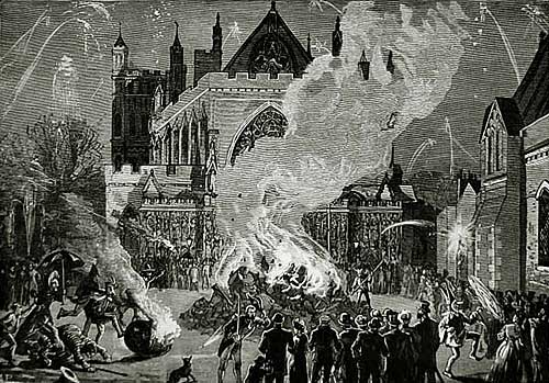 A great feature of this Guy Fawkes’ Day (or night) was a rolling tar-barrel. I am now speaking of a time when the old “Charlies” were the custodians of the peace, before Sir Robert Peel’s “Bobbies”. The several entrances to the Cathedral Yard were called “gates” – though actual gates no longer existed. On Fifth of November nights, “Young Exeter”, as the youths were termed, had great delight in these tar-barrels, and contrary to local bye-laws they sought to rush them out of the yard into the most frequented highways. The Charlies, in long great-coats and armed with pikes seven or eight feet long, placed themselves on the outside of the gates, and there were continual struggles between them. This contest was carried out generally with good humour, but occasionally a heated youth would lose his temper. During one of these contests a daring young fellow took the burning barrel in his hands and hurled it upon the civic defenders – one of whom was severely burnt. Rushing down towards the grand great Western front of the Cathedral to be out of danger, a man got up on the railings and held onto the arm of one of the sculptured Apostles. On leaning forward to see the sport, the stone arm gave way. The poor fellow fell onto the spiked railings and was severely injured.
