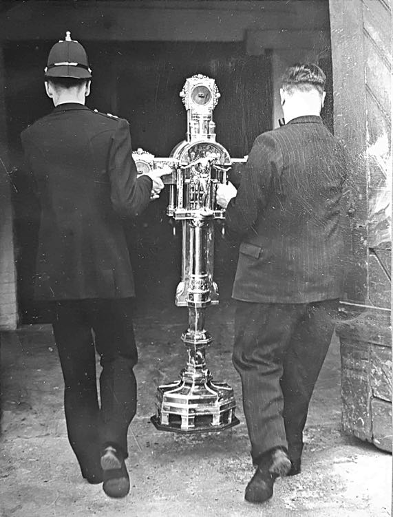 The Diamonds were removed from the cross which was thrown over a hedge at Fenny Bridges, Honiton as the thieves drove back to London. This photo shows me and Eric “Nobby” Clark carrying the cross after its recovery. The diamonds and the thieves were never traced. The cross had been given to the Cathedral by the Lumley family (Joanna’s relatives) from Kenton, and now is displayed in Kenton Parish Church.