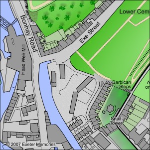 The terrace at the bottom of the steps is West View Terrace. William Hart of the Exeter Art Pottery lived at no 8 in the 1890's, very close to the pottery in Bonhay Road. Below the terrace there was a council yard in the triangle between the Barbican Steps and the leat that ran next to Bonhay Road.