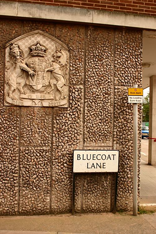 The photo of the side of the post office, was taken just before its demolition in May 2005. Bluecoat Lane has disappeared with the redevelopment. The coat of arms was moved to the mail office in Belgrave Road.