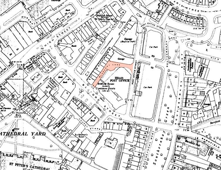 Situated between Post Office Street and Bedford Street, this small lane was a modern addition to the Princesshay development, and not completed until 1962. The Bedford House. The lane started in Bedford Street by the side of the post office. It turned to the righ after 50 metres before joing Post Office Street in front of the city wall. The entrance to the old Princesshay carpark (originally Hughes Garge carpark) was on the corner–see photo above. The entrance to the post office depot was in Bluecoat Lane.