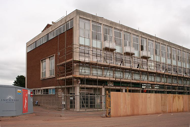 The Bedford Street Post Office just before demolition. The 'coat of arms' can be seen on the side of the building.