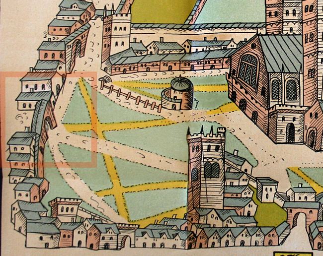Broadgate is within the red outline tint, in this detail from Hooker's map of the mid 16th Century.