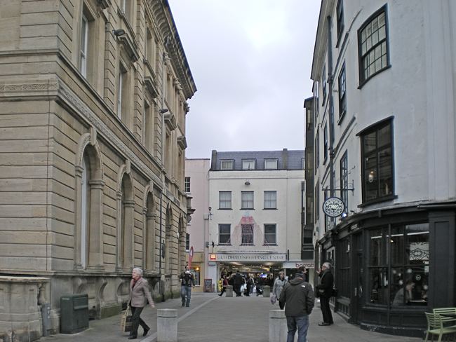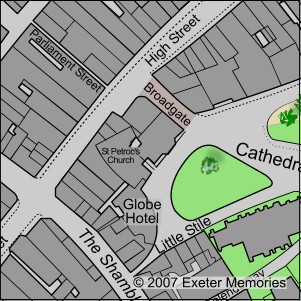 Miss Smale's building was later extended to become the building we know today as Pizza Express, or the former Tinleys. The corner of the City Bank (untinted) can easily be mistaken for the City Bank building, that now houses Jack Wills (clothing). However, the building in the illustration was smaller (see map right), and in 1876/7, it was demolished, along with the corner City Bank, and rebuilt, back towards the High Street, and southwards to St Petrocks Church.