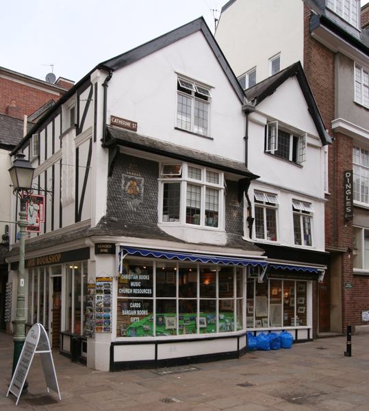 Opposite St Martins Church, No., 1 and 2 Catherine Street, at the entrance to Catherine Street, are two early 15th century, three storey, timber-framed gabled houses. They have later, Georgian sash windows and casements, and the corner building has an oriel window, flanked by hanging slates, over the shop frontage. There are many internal features, including screens, fireplaces, garderobes and late 16th Century painted decoration on the joists and beams, and a cruck roof. There is evidence that John Whytten, a mason signed an agreement to build them on 14th September 1404, for the cost of £6 6s 8d. The houses were probably built to accommodate priests and were converted into shops in the 17th-century. From 1961, It was for the SPCK Christian bookshop, until they closed and is now occupied by Gemstar, jewellers.