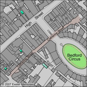 Catherine Street runs from the corner of Cathedral Close, by St Martin's Church to Bedford Street. Before 1942, it ran parallel to the High Street as far as Bampfylde Street. It was one of those thoroughfares that was laid out during the time of King Alfred in the 9th-century. Prior to 1942, it was a narrow congested street full of pubs, shops and small businesses.