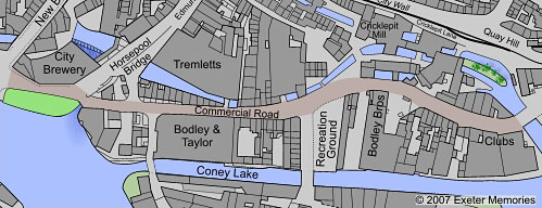 Map The development of the woollen industry along Exeter's leats saw the banks of the River Exe become the engine of growth for the city. A map of 1805 by Roper shows rackfields spreading across Shilhay, with a coal quay at the eastern end where is now found the Warehouse clubs. The map shows Edmund Street in the west, but no sign of Commercial Road.
