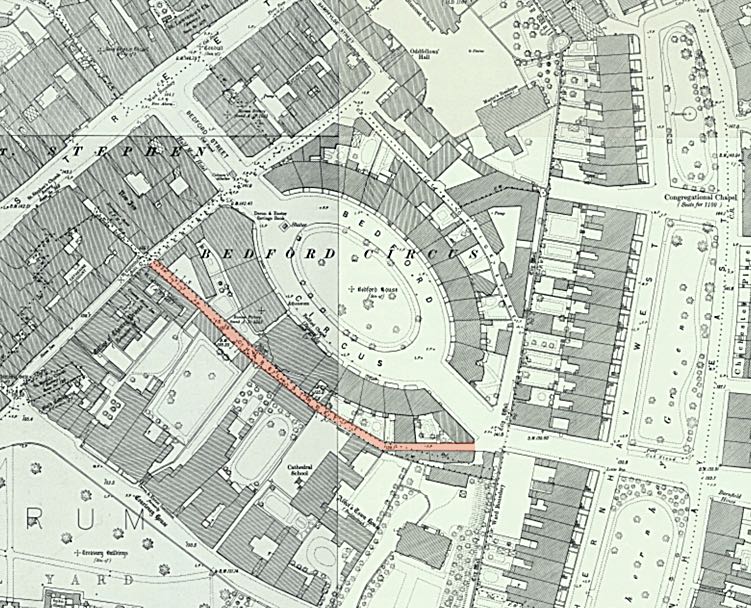 (D&CN&Q) By 1848, the lane was renamed Chapel Street, presumably because there was a rear entrance from the Bedford Chapel into the lane.