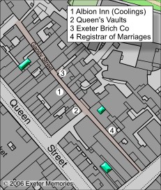 Coolings bar was once the Albion Inn, while the Queen's Vaults on the corner of Little Queen Street was part of the Queens Hotel run by Paul Collings, a Spanish born servant of Sir Harry Smith, whom he accompanied in the Peninsular War and at Waterloo. Other lost inns of Gandy Street include the Volunteer Inn, and the City Arms. In former times, Gandy Street offered more mundane shops and offices, including the Exeter Brick Co and a Registrar of Marriages.