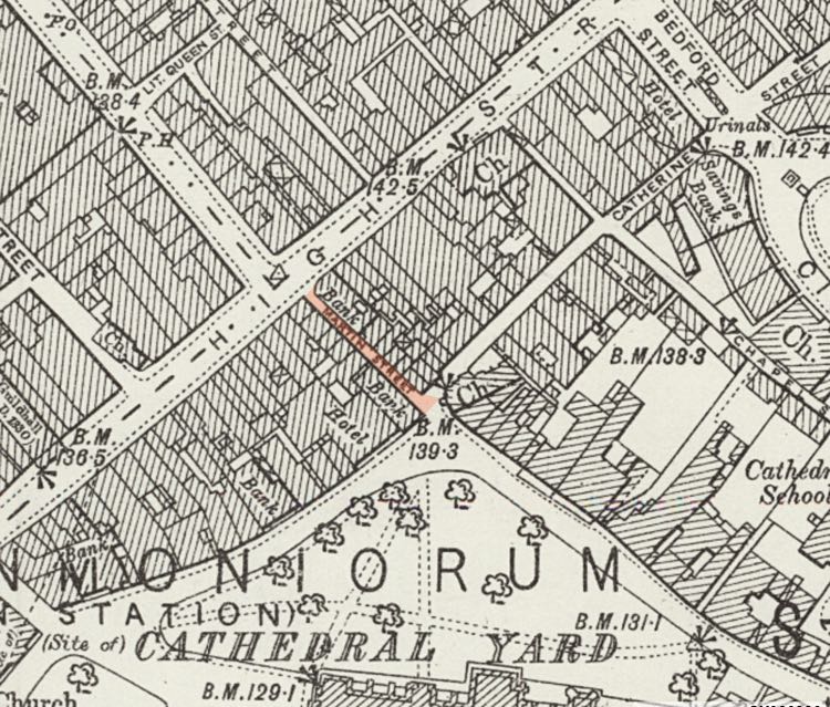 Martins Lane runs from the High Street into Cathedral Close–it has also been known as Luxury Lane and Fyshe Street.