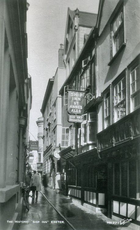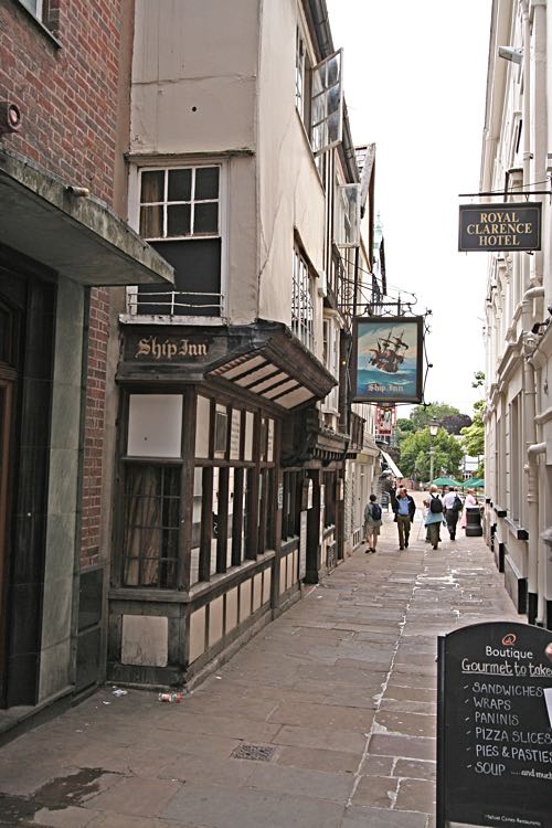 The Ship Inn, is a popular destination for those visiting the historic parts of the city. The modern Martins Lane is narrow, and from the right view point, charming–from the High Street, none of the buildings are of particular interest. There are only three buildings that have real historic value, and they are the Ship Inn, the timber frame shop on the corner of Martins Lane and Catherine Street and the Clarence Hotel opposite. The Clarence dates back to 1769 when it opened as the Exeter Bank. It is a pity, because this little street could be more like Gandy Street with the right tenants, and had the planners said no to the shop less blocks to the north end of the street.